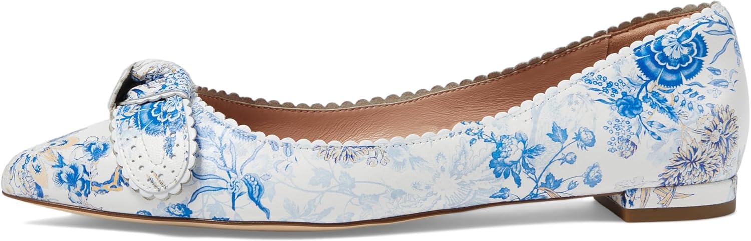 Pointed toe ballet flat with perforated and scalloped bow detail. Scallops along topline for a more feminine look. Back counter cushion for added comfort. 3D Lux Comfort sock providing layers of shock absorption, arch support, and exceptional cushioning designed for all day wear. Leather lined. Buffed Synthetic Outsole that contains 32% recycled rubber content with weave laser design at forepart for traction.